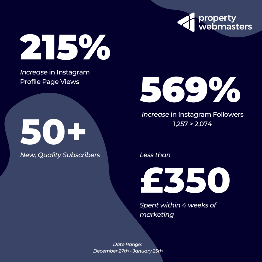 Since launching the campaigns and implementing a solid social media strategy across both organic and paid marketing, the client has seen a 569% increase in Instagram followers alongside a 215% increase in their overall profile visits. Ultimately we have seen 50 new high-quality subscribers to their mailing list within just 4 weeks of marketing.